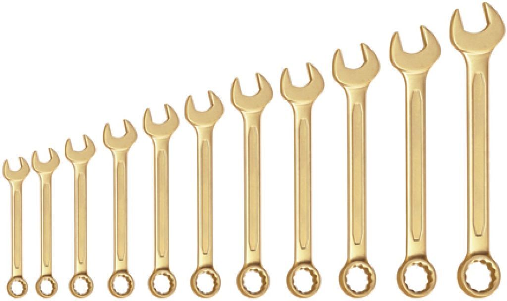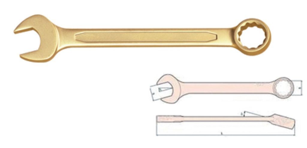 Искробезопасный гаечный рожковый ключ из меди. Предназначен для работы в условиях, где есть риск возникновения искр. Подходит для использования в средах с повышенной взрывоопасностью.